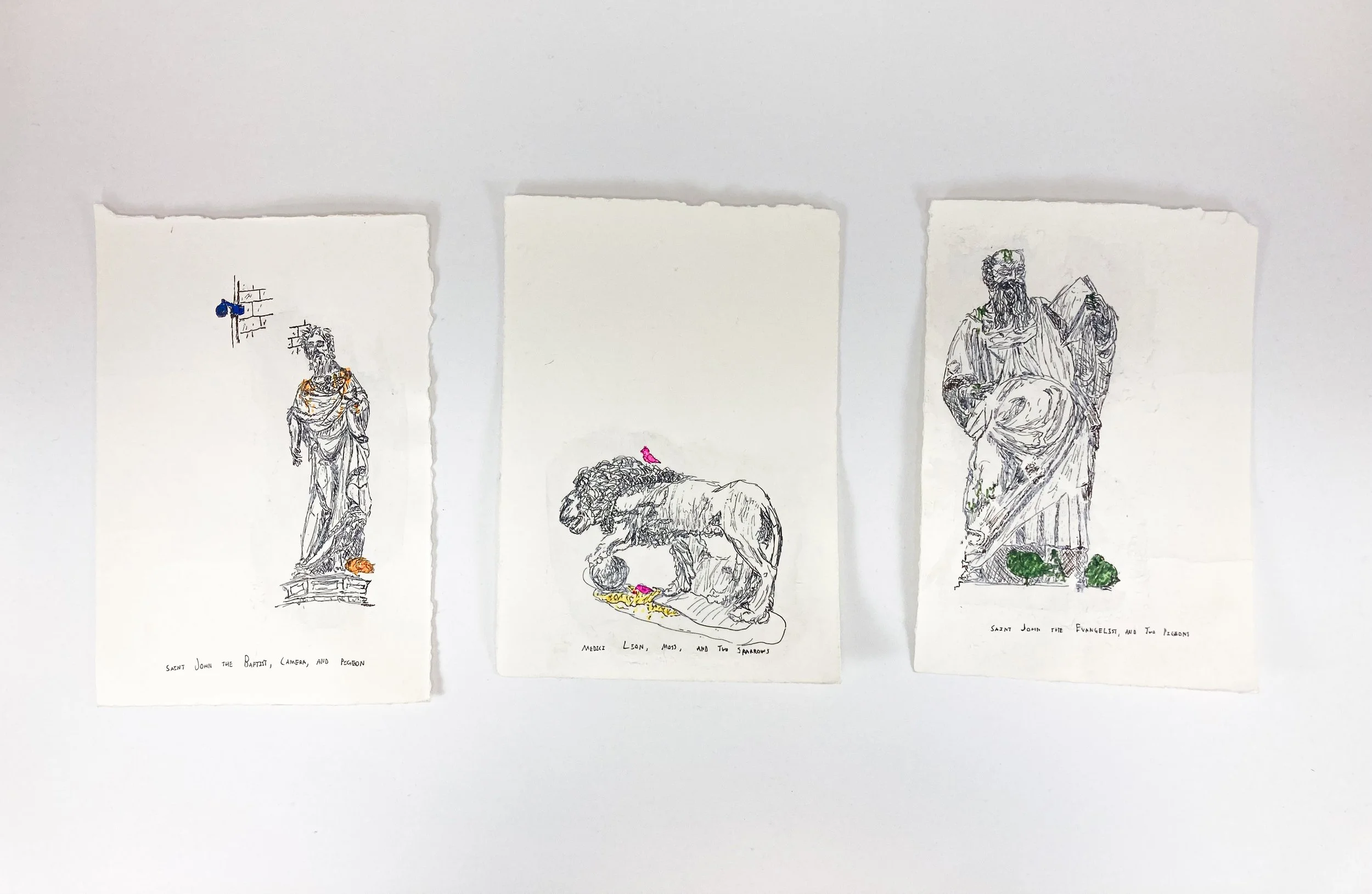 modern additions is inspired by the melding of history and the contemporary that occurs daily on the busy streets of Florence. on-site sketches of sculptures and the variety of modern and living objects that interact with them were photocopied and transferred onto archival paper where additional details were added in pen and marker.